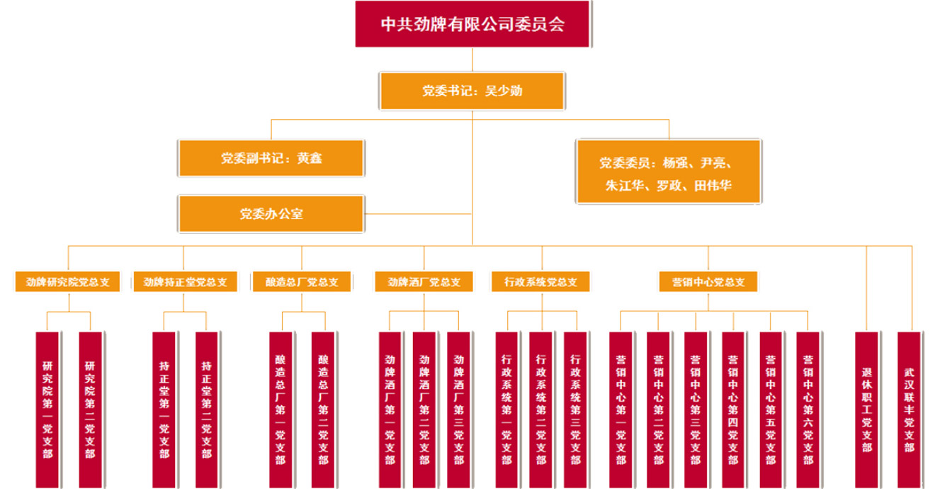 在各级党组织的高度重视和亲切的关怀下,劲牌有限公司的基层党组织随着企业的稳健发展而不断壮大,1996年升格为党委,2013年成立纪委;同时建立健全了工会、共青团、妇联组织,配备了专兼职人员,形成了党建工作齐抓共管的工作格局。目前,公司党委下辖6个党总支,共设20个党支部。